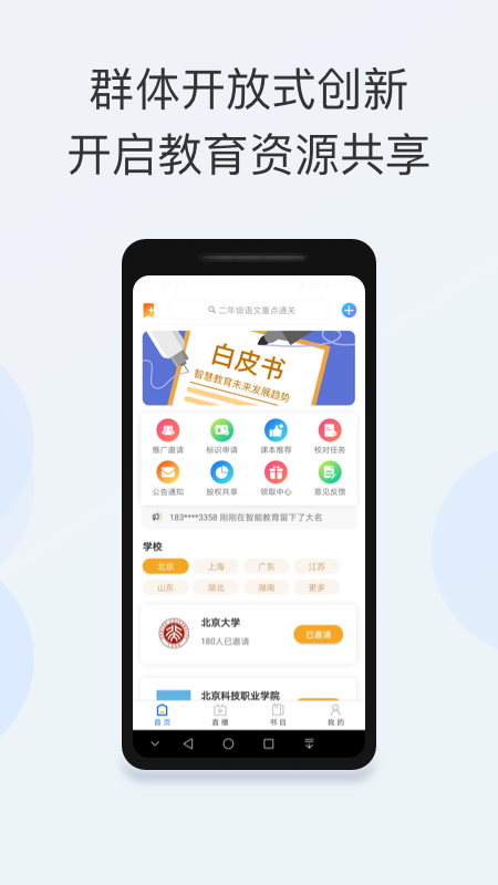 智能教育app,群体开放式创新,开启教育资源共享;角色扮演多重体验,寓教于乐精彩人生;书籍传承历史,数据承载未来;个性自我群体共识,分享自由多边合作。