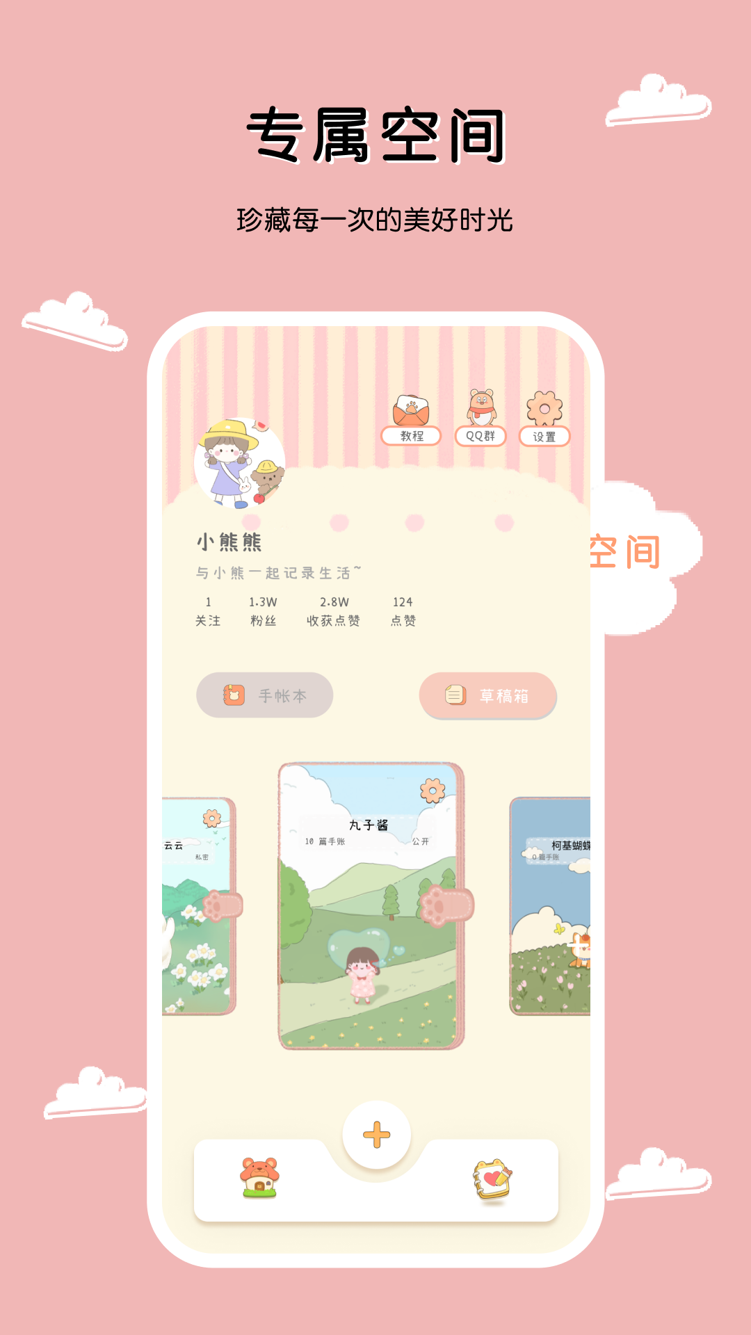 首页是小熊的可移动温馨小家,家具贴纸diy装扮,自定义素材,背景可自定义颜色,真正满足个性化服务。点击+号选择“随记”或者“手帐”开始你的手帐之旅。