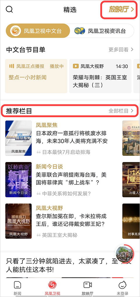 1、app内是可以看电视节目的,点击底部的“凤凰卫视”界面进行观看。