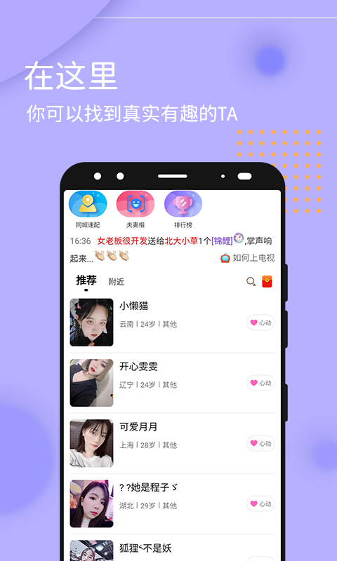 2、同城附近筛选,根据你的当前定位,匹配附近的人,打开定位就能找到身边的人。