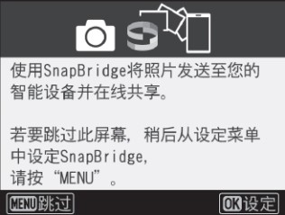 3、若照相机为 D3400 或其他支持 SnapBridge 但不配备 Wi-Fi功能的型号,屏幕中将显示一个确认对话框 ;请轻触确定通过蓝牙进行连接。