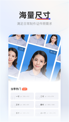 一寸照、两寸照、身份证照、护照照片、简历照片、结婚证照片等各种证件照尺寸格式。