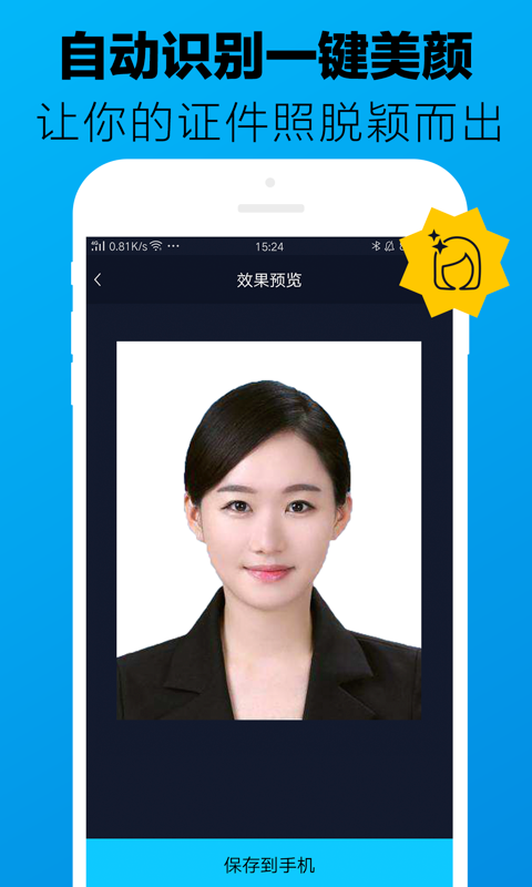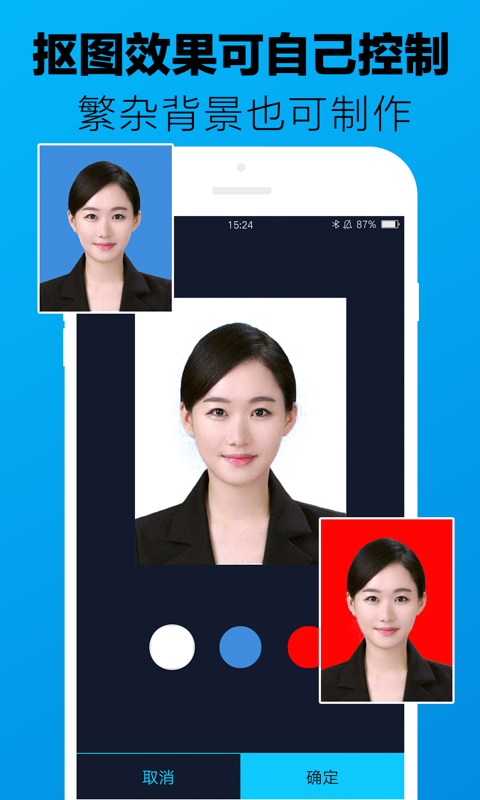 3.软件支持一键将用户照片p上正式服装和背景,让用户能够随时随地拍摄证件照。