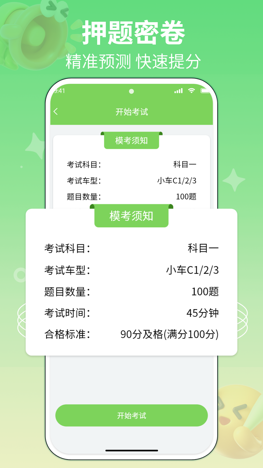 在押题密卷界面,可以查看考试科目、车型、题目数量等信息。例如,某押题密卷的考试科目是科目一,车型是小车 C1/2/3,题目数量为 100 题,考试时间为 45 分钟,合格标准为 90 分及格(满分 100 分)。