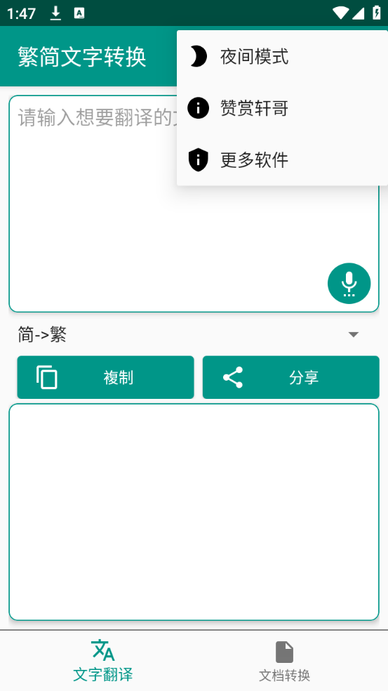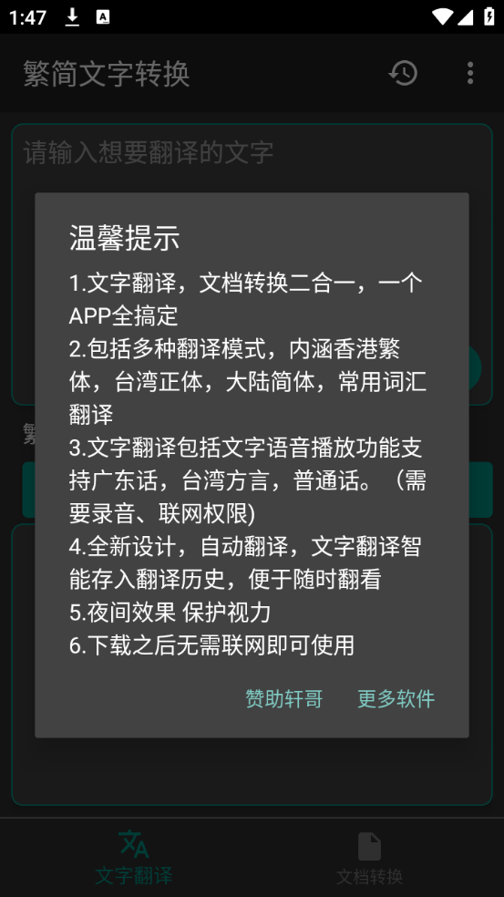 繁简文字转换软件是一款字体翻译的转换软件,有了这个软件无需再担心看不懂繁、简体字啦!用户可以使用软件来进行香港繁体字、台湾繁体字与简体的来回转换,用户可以随时随地的进行转换,没有任何的限制,而且所有的功能都是可以免费使用的,更好的方便用户使用。